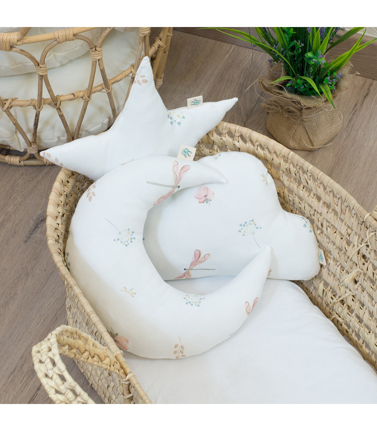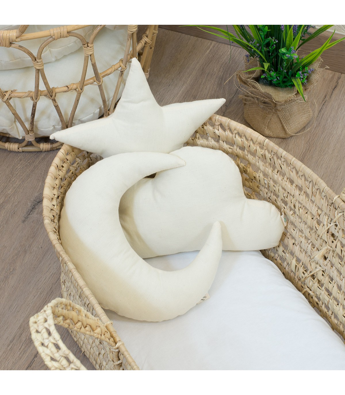 Consta de 3 piezas con formas diferentes: Estrella, Nube y Luna. Con este pack, aportarás estilo y confort a la habitación de tu peque, y tu peque a su vez, los convertirá en sus juguetes preferidos!