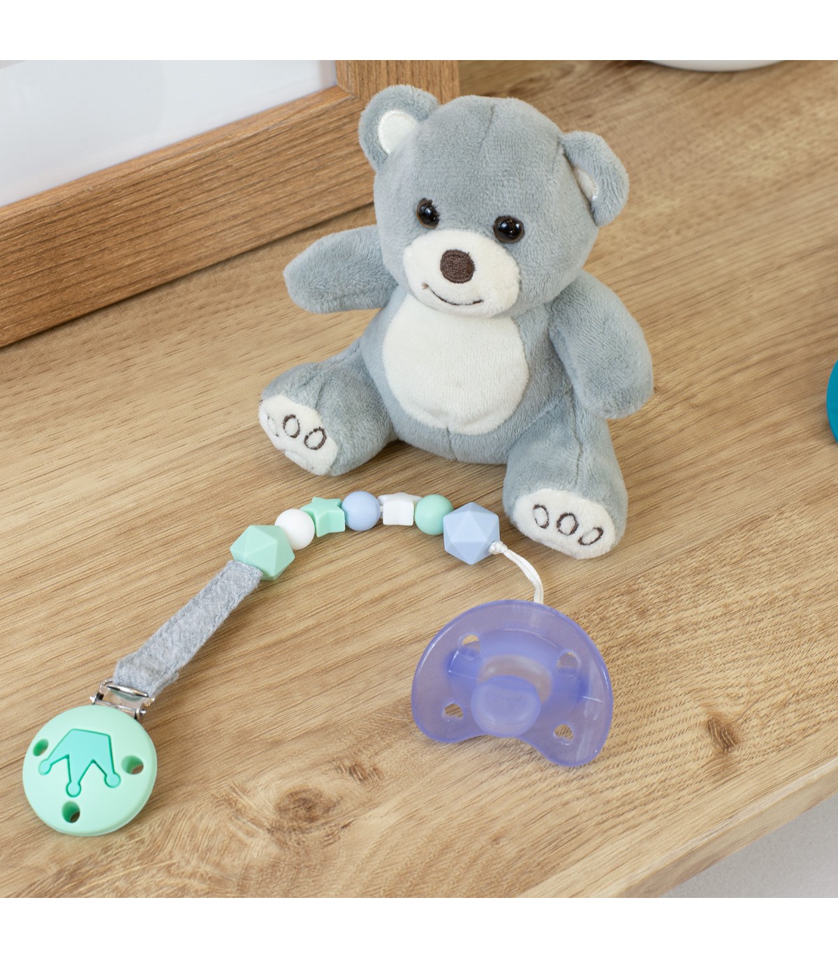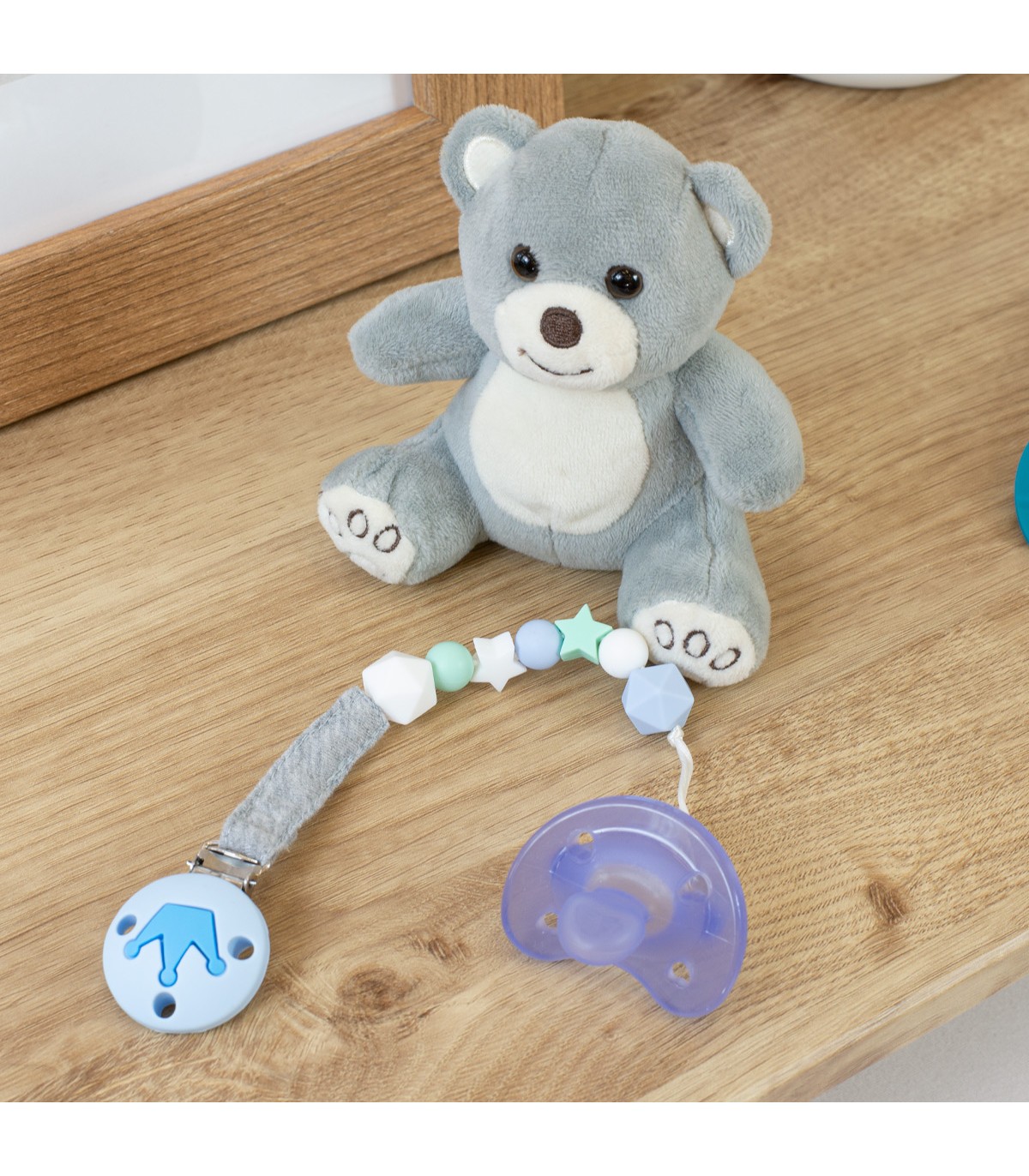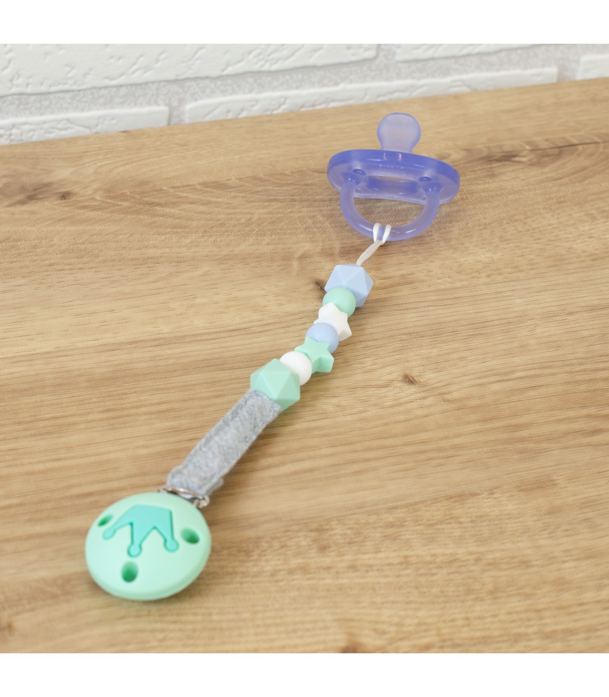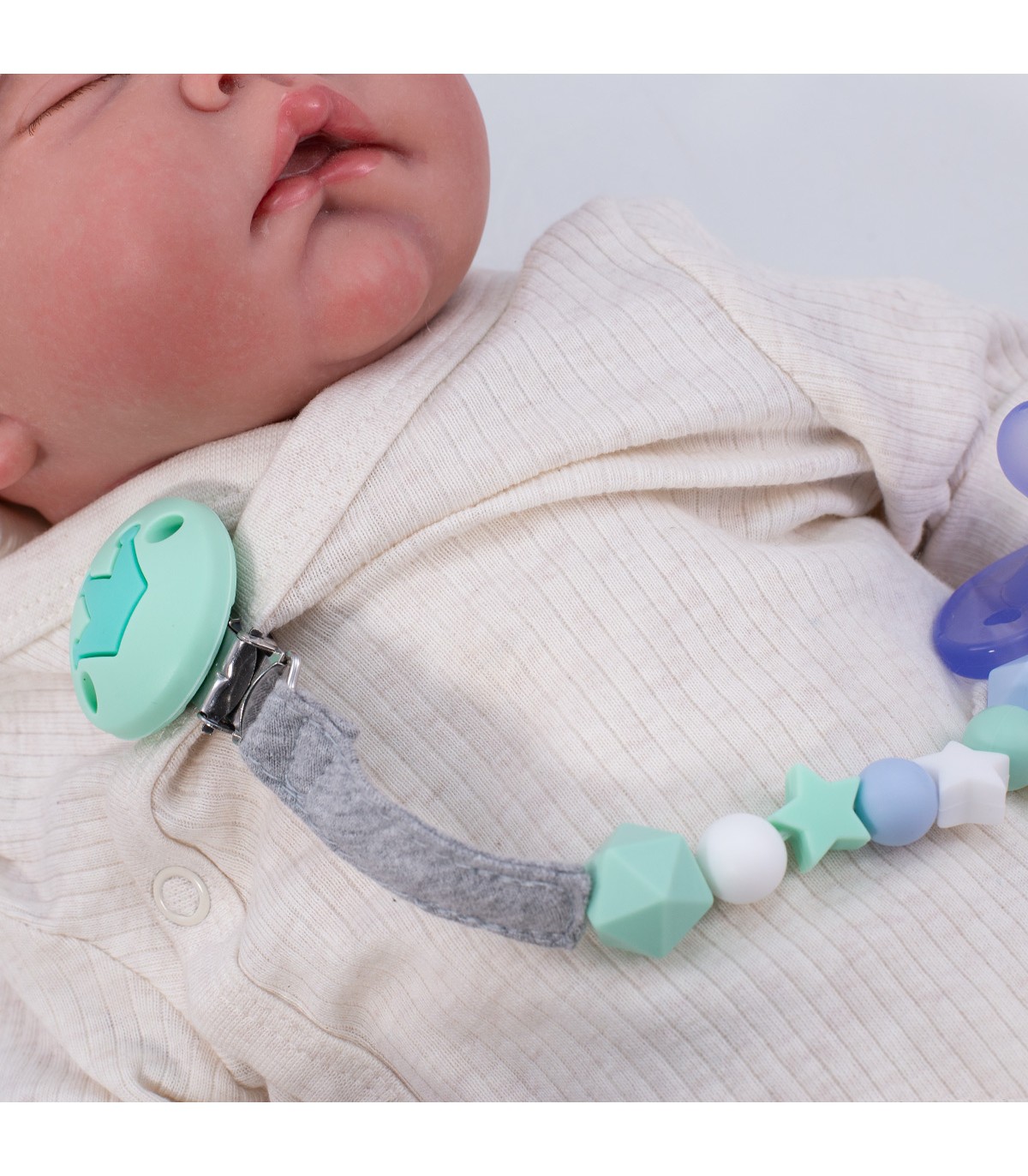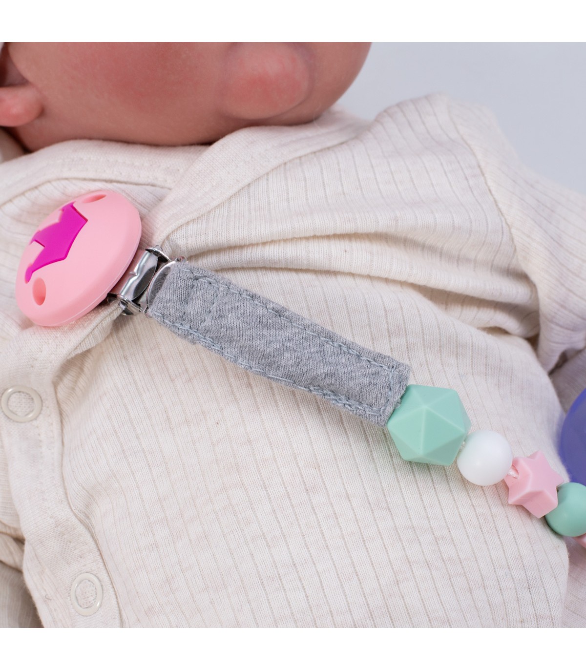 El sujeta chupetes esta confeccionado con una cinta 100% algodón orgánico muy agradable al tacto y cuentas de silicona grado alimentario para que tu bebé pueda mordisquearlo y poder aliviar el malestar que le producen los dientes al salir.